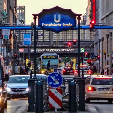 Het gaat niet goed met de ‘Einkaufsmeile’ Friedrichstraße. Grote warenhuizen sloten hun deuren, leegstand volgde. Klanten bleven weg, de straat werd steeds meer een overvolle verkeersader. Dat moet anders en een pragmatisch plan moet de straat van Checkpoint Charlie weer op niveau van concurrent Kurfürstendamm brengen. Een zoveelste plan … Foto: Druk verkeer in de...