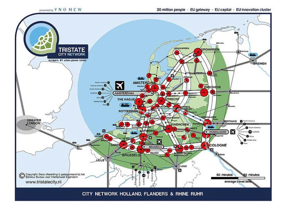 Daarvoor moeten we gaan naar een van de deelnemende universiteiten, die van Wageningen. Die schrijven in hun rapport (PDF) dat het Tristate-Cityplan een particulier initiatief van het bedrijfsleven is, zoals de branchevereniging VNO.