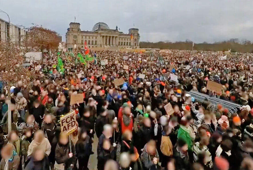 Afgelopen zondag verzamelden zich tussen de 80.000 en 250.000 demonstranten bij de Reichstag. Talloze organisaties over heel Duitsland hadden hiertoe opgeroepen. Het was volgens de organisatie een ‘Aufstand der Anständigen’, een opstand van de nette mensen. Steen des aanstoots was voornamelijk de AfD die momenteel 1 op de 5 Duitse stemmen lijkt te trekken. Niet minder gehaat bleek het CDU van Friedrich Merz, een voormalige functionaris van Blackrock en nu partijleider van de conservatieve CDU, de partij van de vorige bondskanselier Angela Merkel.