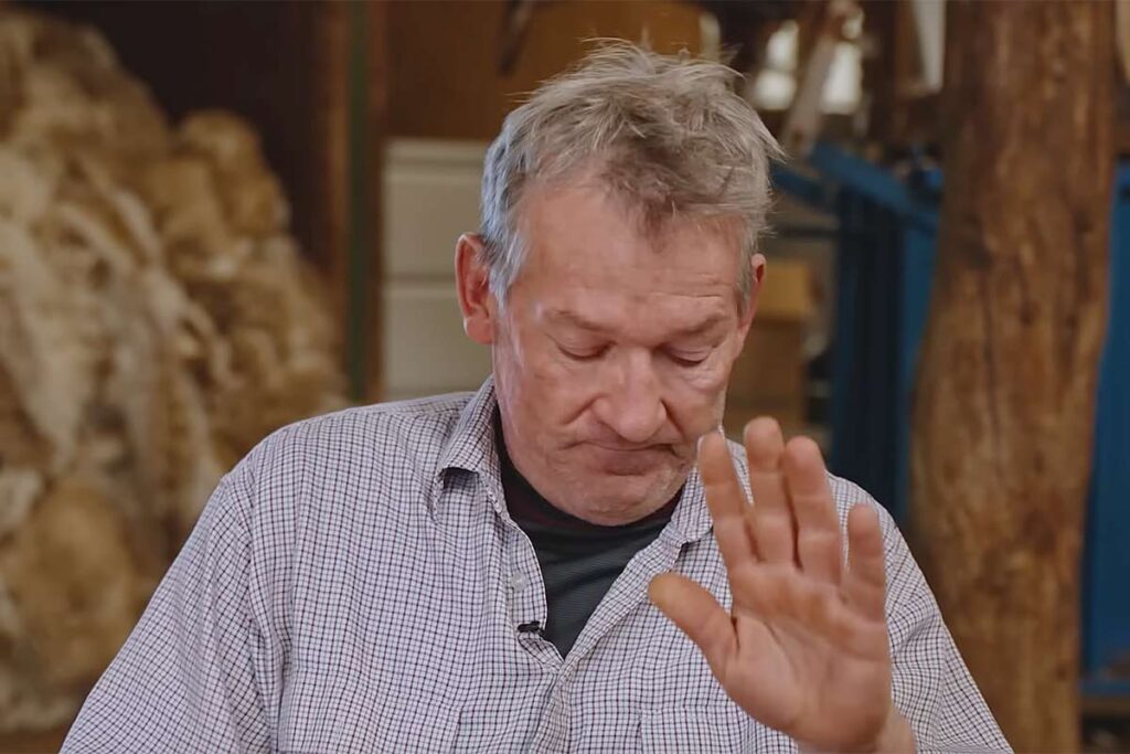 Schapenhouder Nathan Lidgett kan zijn tranen niet bedwingen over de gevolgen voor zijn gezin. (videofragment achter foto)