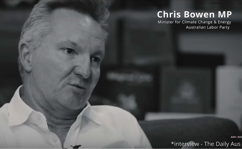 “We hebben nog 8 jaar om onze doelen te halen”, zegt minister Chris Bowen. (videofragment achter foto)
