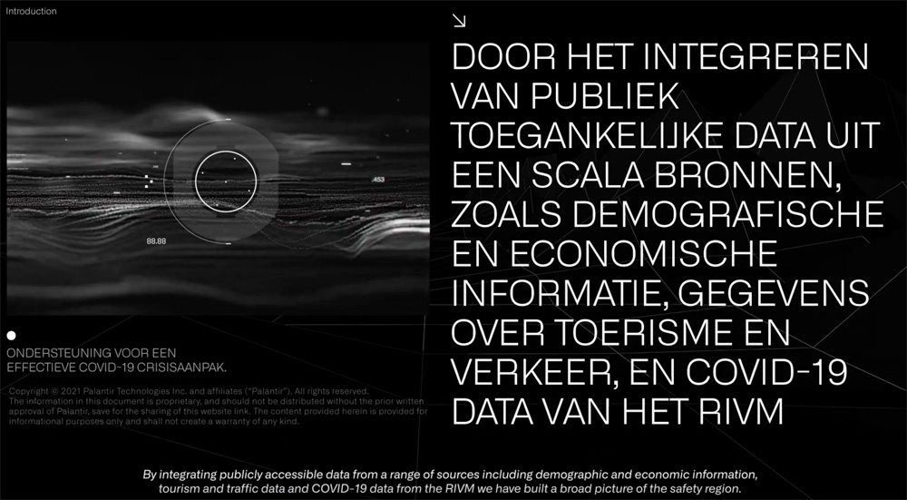 Palantir verzamelde en integreerde voor dit doel openbaar toegankelijke gegevens uit een reeks bronnen, waaronder demografische en economische informatie, verkeers- en mobiliteitsgegevens en Covid-19-gegevens. Met deze dataverzameling kon de reactie op ‘de crisis’ worden gestuurd. Alle denkbare informatie werd verzameld, gecombineerd en geanalyseerd.