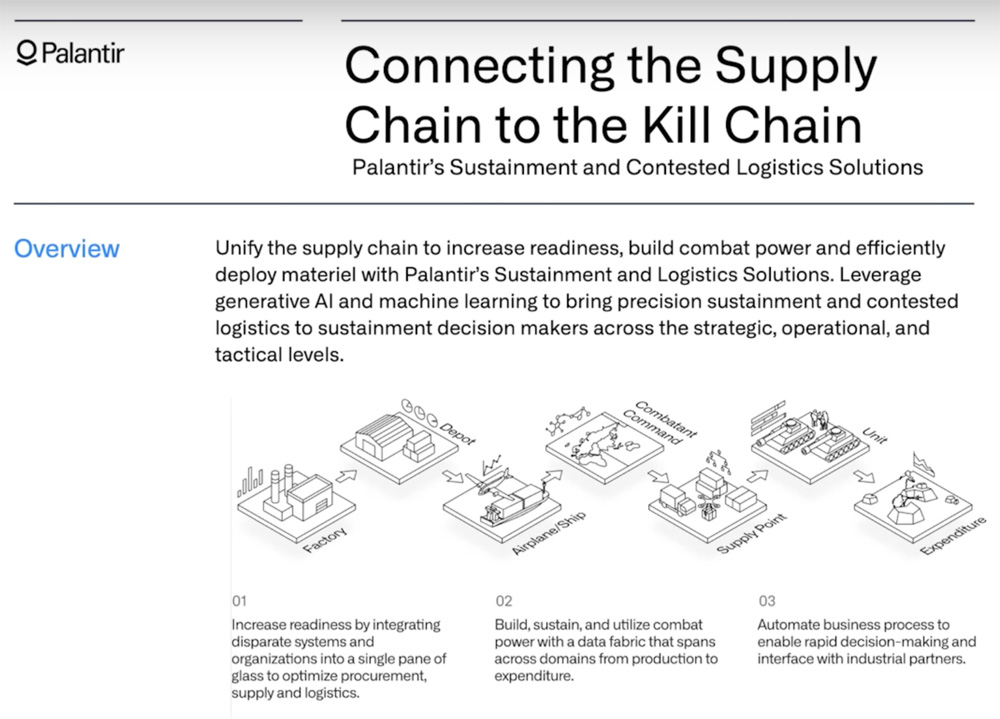 Palantir’s missie is om de VS en haar Westerse bondgenoten te ‘helpen’. De betrokkenheid van Palantir bij de oorlog tegen de Palestijnen is inmiddels geen geheim meer. Karp is duidelijk over de positie van zijn bedrijf: “We stand with Israël”. Op zijn LinkedIn account schreef hij: “De Raad van bestuur van Palantir zal volgende week in Tel Aviv bijeenkomen voor de eerste vergadering van het nieuwe jaar. Ons werk in de regio is nog nooit zo belangrijk geweest. En het zal doorgaan.”