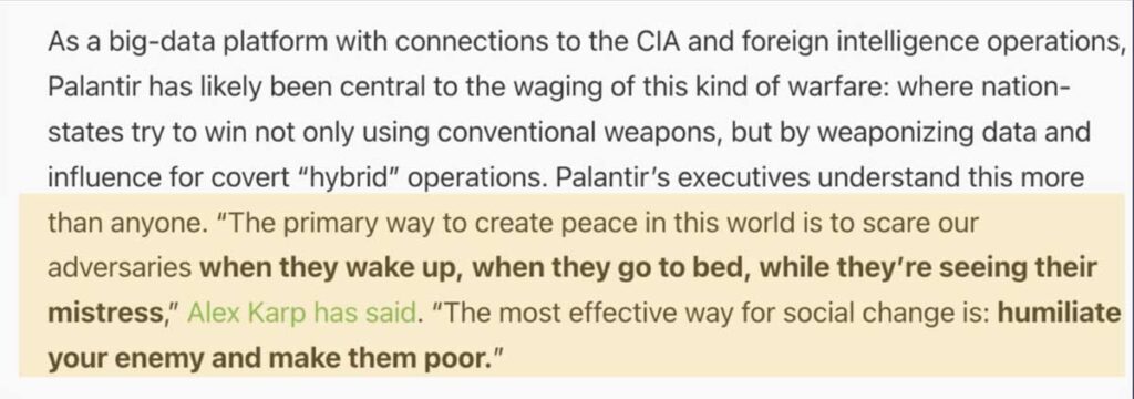 Werkers bij Palantir krijgen van Karp vooraf de boodschap dat als je niet eens bent met de inzet van het bedrijf voor “legitieme activiteiten van de VS en haar bondgenoten in verband met oorlog” dat je beter niet bij Palantir kunt komen werken. Hetzelfde geldt voor Amazon (serverpark voor defensie) en Google (do no evil). Ook zij zetten, naar hun civiele activiteiten zich in voor geheime diensten en defensie. Wel heeft Google een militair programma gestopt waarna Palantir het programma overnam. Karp heeft geen scrupules: “Ik voel me prima bij de wetenschap dat Palantir niet populair is”. En dat is begrijpelijk omdat zijn klanten evenmin scrupules hebben en verdienen aan oorlog.