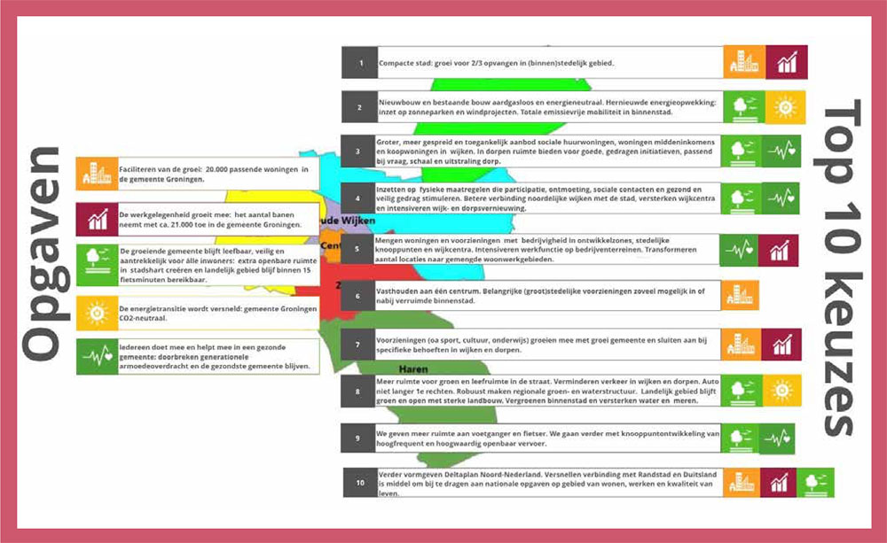 De basis hiervoor is de Omgevingsvisie. Hierin worden de contouren geschetst van hoe uw dorp of stad er in de nabije toekomst uit gaat zien. Eigenlijk is de ombouw al gaande. Onderstaand een voorbeeld van zo’n Omgevingsvisie, in dit geval van de stad Groningen. Het hele document vindt u hier.