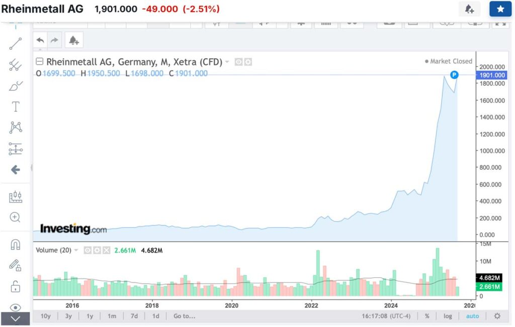 Het financiële hart van Rheinmetall maakte in het 1e kwartaal van 2022 al een sprongetje toen Rusland met zijn ‘Special Military Operation’ begon en Oekraïne binnenviel. Maar nog te vroeg gejuicht. Pas toen medio 2024 duidelijk werd dat Duitsland zich zou herbewapenen vloog de koers van Rheinmetall door het dak.