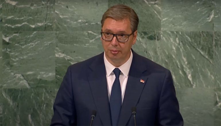 Foto: Aleksandar Vucenić, president van Servië tijdens zijn toespraak in de Verenigde Naties