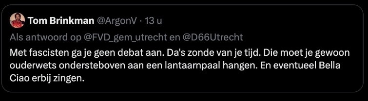 Zo uitte een ambtenaar uit de omgeving Enschede een ernstige bedreiging jegens de 19-jarige FVD-lijsttrekker in Utrecht, Nina Bodnárová. Volgens de Tukker is het ‘zonde van je tijd’ om het debat aan te gaan met ‘fascisten’. Hij heeft een beter idee: ‘Die moet je gewoon ouderwets ondersteboven aan een lantaarnpaal hangen. En eventueel Bella Ciao erbij zingen.’ Dit schrijft Nieuw Rechts. Onder het inmiddels verwijderde bericht op X.