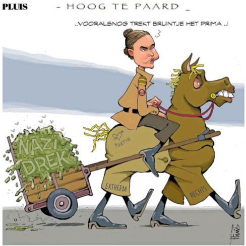 Ook de cartoon in als ‘rechts’ bekendstaande Telegraaf is heeft een hoog vuigheids gehalte. De vergelijking met de NAZI’s is inmiddels een platitude geworden, voor diegenen die geplaagd door intellectuele luiheid toch willen schelden en demoniseren.