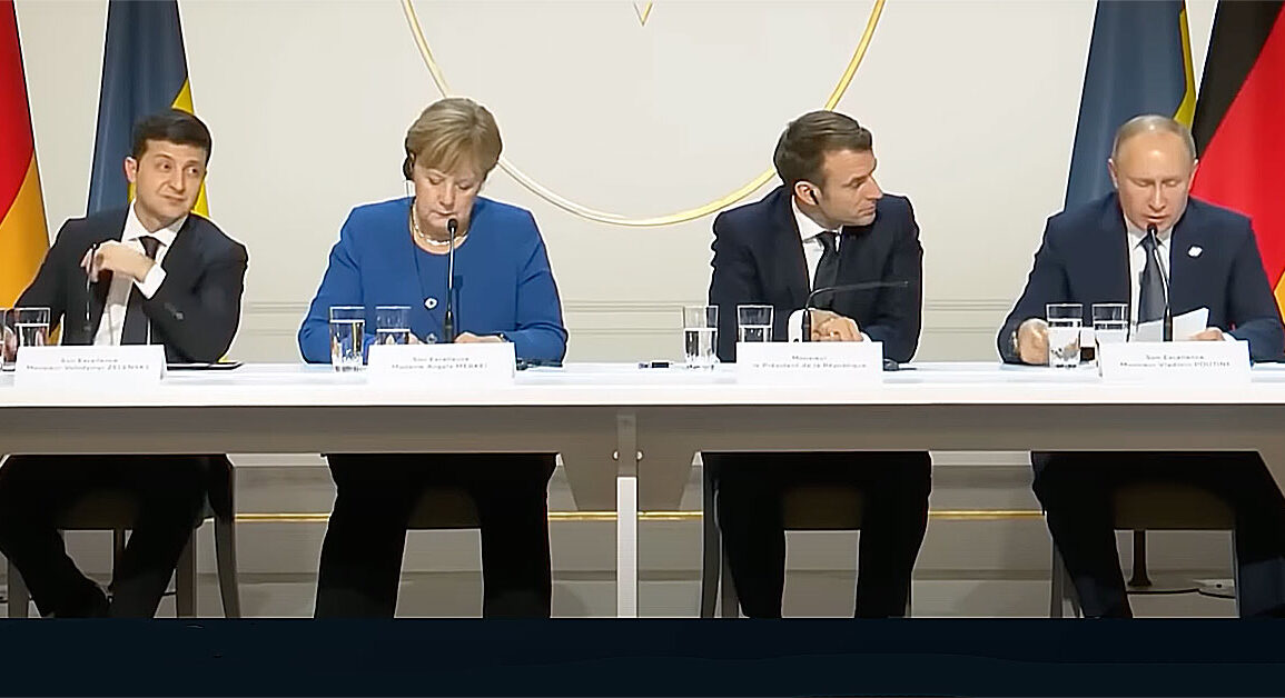 Foto: Fragment uit onderstaande video ten tijde van de MINSK-besprekingen waarbij Zelensky openlijk de sprekende president Poetin uitlacht, wetende dat de akkoorden nooit zouden worden uitgevoerd.